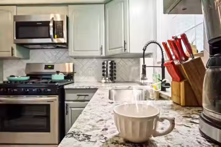 Kitchen & Dining: Just beyond the living room there is a dining room table that sits 4. The cozy kitchen allows for ample counter space and all the cooking utensils to prepare a full meal. Gas stove, oven, refrigerator, dishwasher, instant pot, coffee maker, and all necessary cookware, bakeware and glassware at your fingertips. We also provide spices to flavor your dishes.